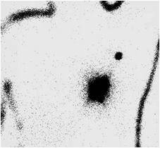 センチネルリンパ節の画像を示します。 注射部位に放射能がありますが、腋窩リンパ節(↓)に放射能が流れ込んでいることが分かります。