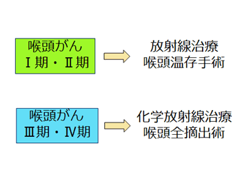 一般に早期がんでは放射線を第一選択にその効果をみて手術を組み合わせていきます。声を残せるかどうかの判断が重要になってきます。進行がんでは手術が中心となり場合により放射線、抗がん剤を組み合わせていきます。