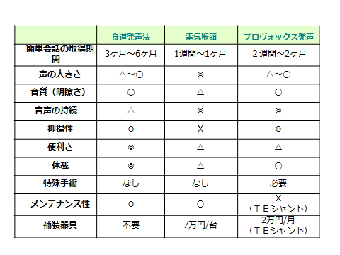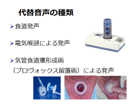 手術には大きく分け喉頭部切術と喉頭全摘術があります。喉頭部分切除術は早期がんに行われ、声帯を一部残す手術です。声の質は多少悪くなりますが声を残すことができます。喉頭全摘術は部分切除の適応を逸脱した早期がんや進行がんに行われ、声は失われます。そこで術後食道発声や電気喉頭など代替音声で補うことになり練習が必要となります。
