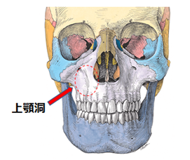 鼻腔(びくう)の中は鼻中隔(びちゅうかく)で左右に別れています。左右の鼻腔は外側にある3つのヒダで入りくんだトンネル状になっています。その外側に左右4つずつ空洞があり、これを副鼻腔(ふくびくう)といいます。上顎洞(じょうがくどう)は副鼻腔のなかで最大の空洞で鼻腔の外下方に位置し、この上顎洞に発生した悪性腫瘍を上顎洞がんと呼びます。