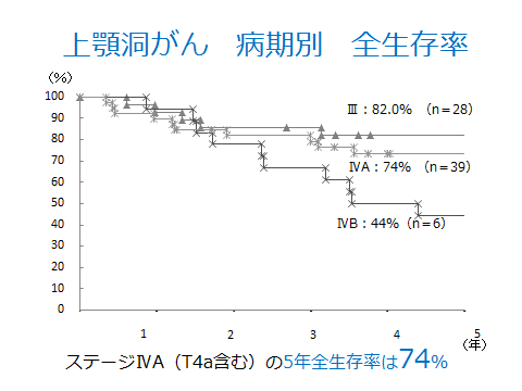 上顎洞がんは発見されたときは症状が出現している場合がほとんどですから、リンパ節転移がなくてもstageV以上の進行症例が大多数を占めることが特徴です。