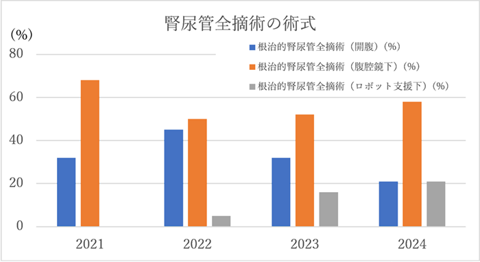 転移が無い場合、患側の腎・尿管および尿管開口部周囲の膀胱壁を合併切除します。尿路がんの多発性を考慮した最も標準的な治療法です。がんの進展度に応じて開腹手術、腹腔鏡下手術、最近ではロボット支援下手術などの術式が検討されます。対側腎機能が正常であれば、術後の制約は特にありません。また、転移が無くても、根治切除が困難であると判断される筋層浸潤がんの場合、抗がん剤による化学療法を施行した後、手術を行うことがあります。逆に、手術後、病理検査の結果にて再発の危険性が高いと判断される場合(壁外浸潤やリンパ節転移が確認された方)は、術後に免疫療法や化学療法を施行することもあります。また内視鏡手術にて完全切除が困難な膀胱がんの合併がある場合は膀胱全摘除および尿路変向術も必要となることがあります。