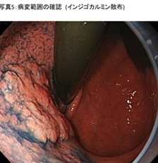 インジゴカルミンや酢酸の散布、NBI(Narrow Band Imaging:特殊な光を用いた技術)を利用した拡大内視鏡を使用して、病気の範囲を確認します。 - 病変周囲のマーキング (写真6)