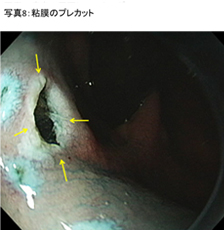 注射針を粘膜下層に刺し、ヒアルロン酸(インジゴカルミンを混ぜたもの)を注入します。これにより、粘膜下層が盛り上がり、筋層を傷つけることを防ぐことができます。 - 粘膜のプレカット (写真8)