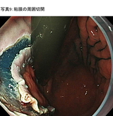 特殊な電気メス(ITナイフ2®など)を使用して、マーキングの外側を全周にわたり切開します。 - 粘膜下層の剥離 (写真10)