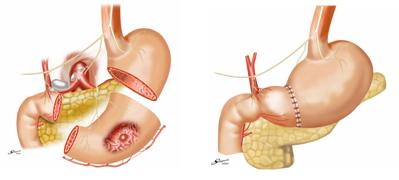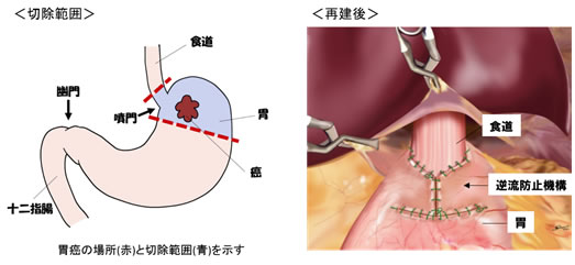 胃亜全摘術では胃の入り口にある逆流防止弁と食欲などに関連するホルモンを分泌する胃の上部が温存できます。胃全摘を行った場合と比べて逆流症状や、術後の栄養状態が優れていると報告されています。