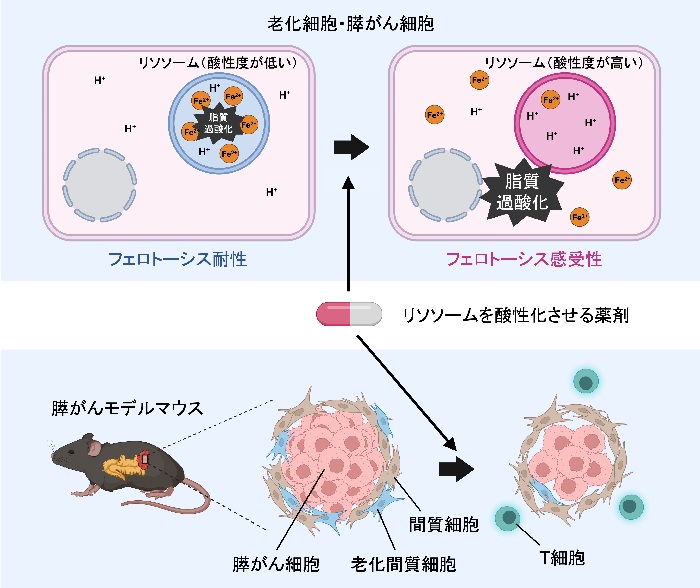 そこで、V-ATPaseを活性化させる化合物であるEN6を使用し、老化細胞のリソソームを再び酸性化することで、老化細胞のフェロトーシス感受性が回復するか検討しました。その結果、EN6を処置した老化細胞では、リソソーム内に局在していた2価鉄イオン(Fe2+)や脂質ラジカルがリソソーム外に放出され、老化細胞のフェロトーシス感受性が回復しました(図)。また、リソソーム酸性度の低下を伴うフェロトーシス抵抗性は、老化細胞だけでなく、抗がん剤の処置により生じた治療抵抗性のがん細胞においても見られることや、これらのがん細胞にEN6を処置することでリソソームを酸性化した場合も、フェロトーシス感受性が回復することが分かりました。さらに、膵臓がんのモデルマウスにEN6を投与すると、腫瘍組織にフェロトーシスが生じ、がん細胞や老化した間質細胞※6が減少して腫瘍の成長が抑制されるとともに、抗腫瘍免疫※7に関わる免疫細胞(T細胞)が増加することが確認されました(図)。