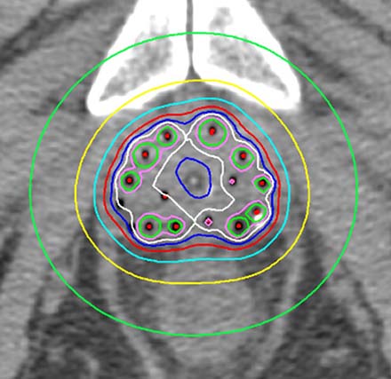 高線量率組織内照射法は、前立腺内に針を挿入し、放射線を放出するイリジウム192線源(直径0.9mm)をその針の内腔に一時的に停留させることで、短い時間でたくさんの放射線をあてる治療法です。線源の位置およびその停留時間を変化させることにより自由な線量分布を作成することができるため、尿道、直腸や膀胱などの線量を最小限にし、病巣(前立腺や精嚢)に対して十分な放射線をあてられることがこの治療法の利点です。