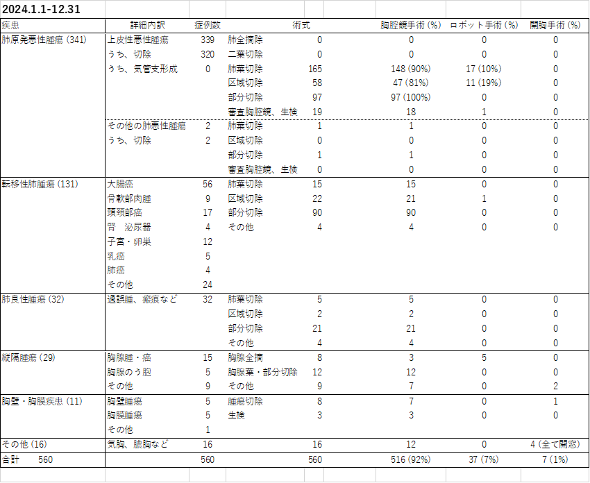 2024年はコロナ禍の影響から脱却しましたが、肺癌切除数は322例(生検や審査胸腔鏡を除く)でした。コロナ禍前のp2019年と比較して減少傾向になっています。全身麻酔下の手術は560例でした。今後は導入化学療法後の患者さんやサルベージ手術(救済手術)の頻度が増加することが予想されます。