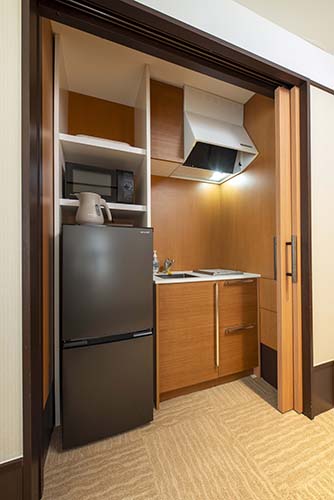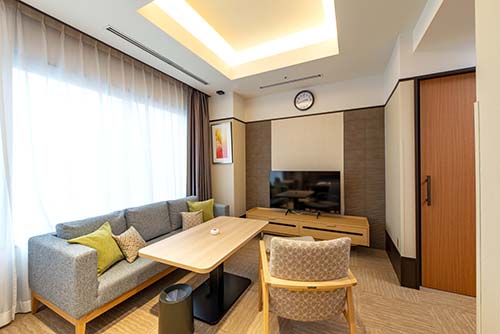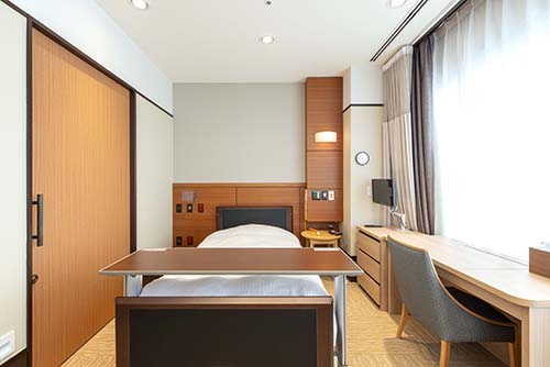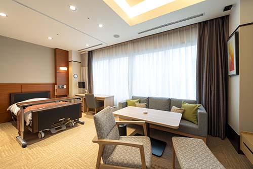 電動ベッド/電動カーテン/ベッドサイド情報端末/床頭台/デスク(ドレッサータイプ)/有線放送/電話/通訳専用電話/トイレ/浴室/洗面化粧台/アメニティセット/キッチン/冷蔵庫(2ドア)/電子レンジ/電気ケトル/カトラリーセット/クローゼット/テレビ(50型)/応接セット(ソファ・アームチェア・リビングテーブル)/その他