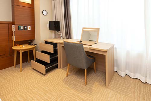 天気の良い日にはゲートブリッジや羽田空港を飛び立つ飛行機をご覧いただくことができ、ドレッサータイプのデスクや食器類を備えたキッチンなど療養環境も充実した、快適さと機能を兼ね備えたお部屋です。