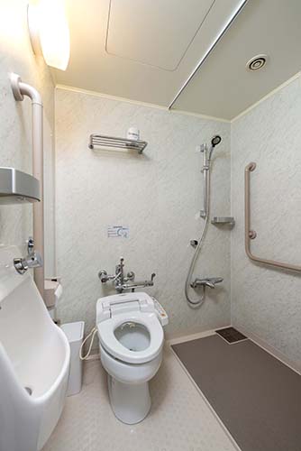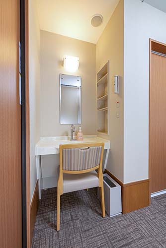 トイレ、シャワー、付き添いの方もお休みいただけるソファーベッドなどを完備し、落ち着きのある色調で療養ができる、くつろぎの空間です。