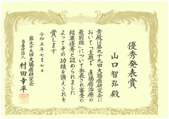 【受賞情報】当院大腸外科医長の山口智弘が、2023年第99回大腸癌研究会学術集会「主題I 直腸癌治療の最前線」にて優秀発表賞を受賞しました