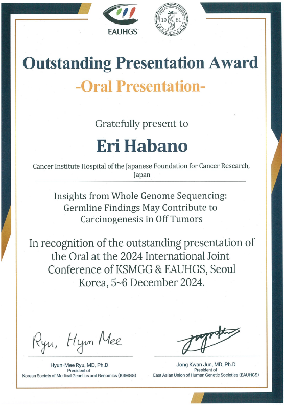 【受賞情報】当院臨床遺伝医療部の幅野愛理が、2024年12月に韓国ソウルで開催された東アジア人類遺伝学会連合(EAUHGS)年次会議でOutstanding Presentation Awardを受賞しました。