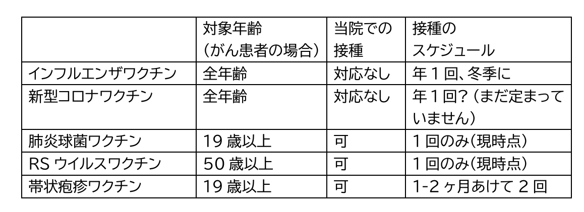 肺炎球菌ワクチン、RSウイルスワクチン、帯状疱疹ワクチンの 3 種類のワクチンが接種可能ですので、ご希望があれば、外来主治医にご相談ください。