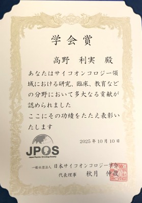 【受賞報告】当院 乳腺内科 部長 高野 利実 が、日本サイコオンコロジー学会 2025年度学会賞を受賞しました