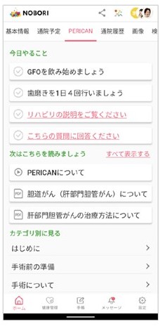 ●「PERICANアプリ」では、従来冊子で提供していたERASの説明内容を動画化し、理学療法士や管理栄養士による専門的な解説をアプリ上でいつでも視聴できるようになります。患者さんはリハビリテーションの正しい方法や術前・術後の栄養管理について、専門スタッフのわかりやすい動画指導を通じて、より深く理解し実践することができます。