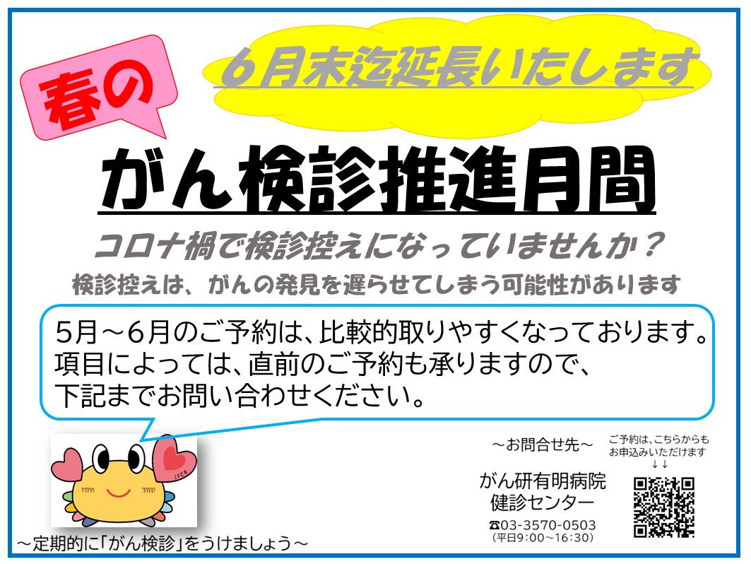 健診センターでは、『がん検診推進月間』として、4〜5月のご予約を強化してまいりましたが、6月末まで延長いたします。