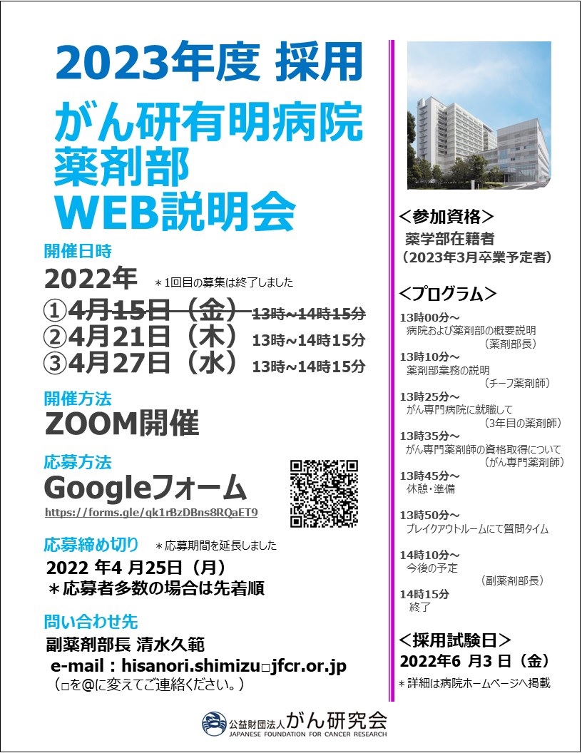 この度、公益財団法人がん研究会有明病院では、2022年6月3日(金)に薬剤師採用試験を実施致します。(2023年4月採用予定の入職希望者が対象となります。)