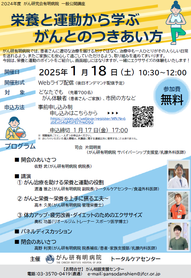 2025年1月18日(土) 一般公開講座「〜栄養と運動から学ぶがんとのつきあい方〜」開催のお知らせ