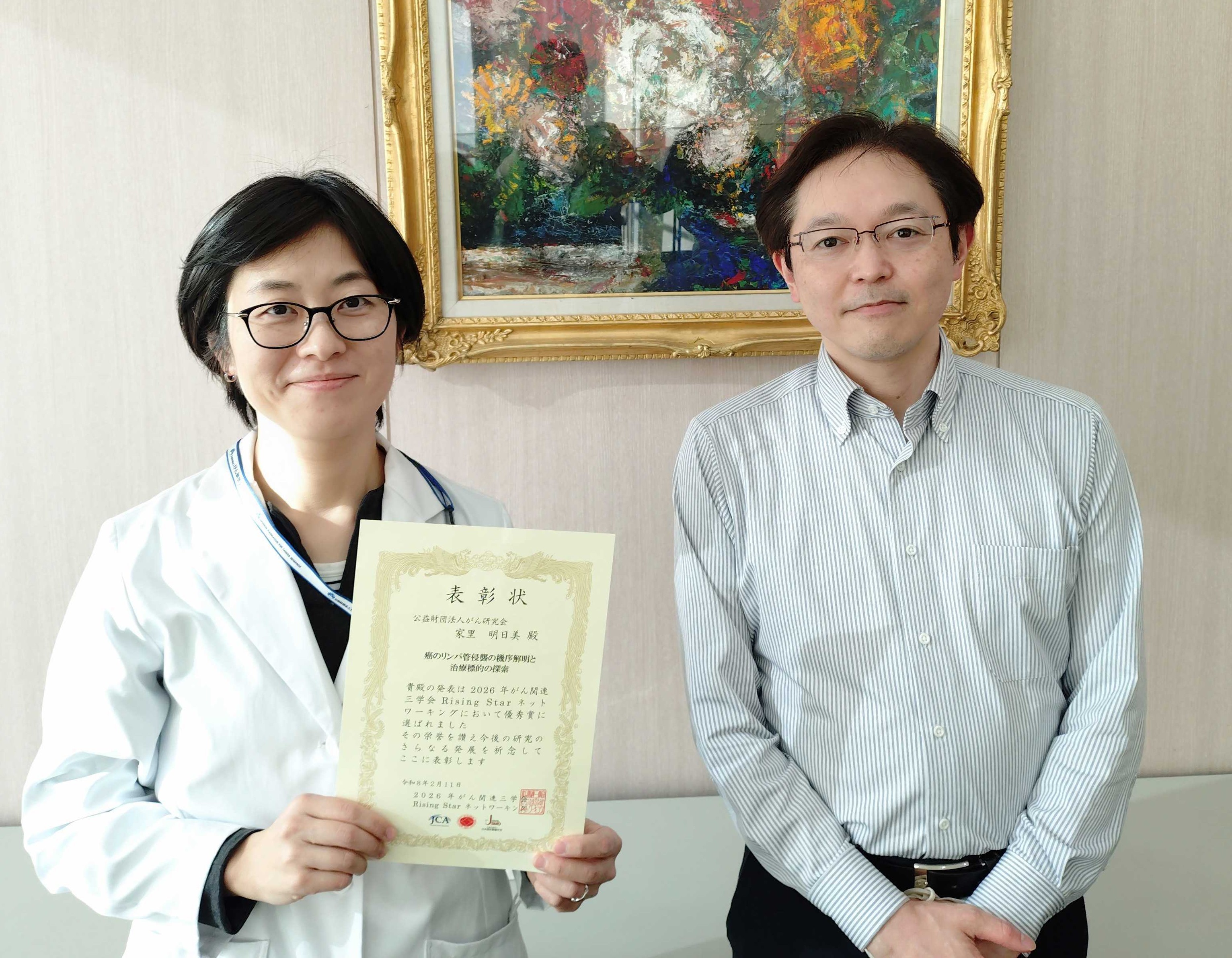 この度は、三学会合同の研究交流の場で、参加者の皆様の投票により本賞を頂戴できましたこと、大変光栄に存じます。多くの先生方に研究に関心をお寄せいただけたことが何より嬉しく、今後の大きな励みとなりました。本研究は、癌のリンパ管侵襲の成り立ちの原理を明らかにすることを目指し、がん研での臨床検体を基盤として展開してきたトランスレーショナル研究の成果です。ご指導・ご支援くださった多くの皆様のお力添えの賜物と、心より感謝申し上げます。今後も臨床と研究をつなぐ挑戦を続けてまいります。
